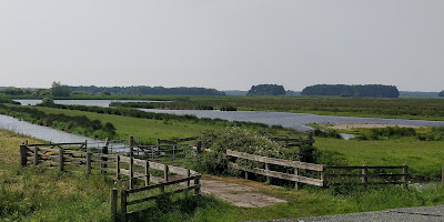 I crossed the line, walked round the field. Reed buntings and yellowhammers sang in the rough between the field and the reserve. The surprise of the day was two kingfishers flying across the path right in front of me and heading off for the distant reedbeds. I watched them on their way and joined the path that runs round the outside of Martin Mere. One of the unexpected outcomes of the lockdown period is that this walk's pretty much become routine for me. Cetti's warblers, chiffchaffs, willow warblers and blackbirds sang in the hedgerows, sometimes accompanied by robins or wrens, others by song thrushes or chaffinches, and every so often by a pheasant. Behind the hedge in the reedbeds beyond reed warblers, reed buntings and sedge warblers sang, coots quarrelled and greylags muttered to keep their goslings in line. At a couple of points I could see some of the pools beside the reedbed hides, avocets and lapwings wading in the shallows or chasing off passing crows and gulls.