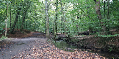 The path down from the bus stop in Roe Green is the most immediately obvious one to find. Not long after you go through the gates the path splits, one looping round the edge of the woods to the Roe Green Loop, one following Kempnough Brook and one crossing the brook and looping round to meet the second path at the motorway to follow the brook to Old Warke Dam. There's a maze of other paths you can explore for a good walk round.
